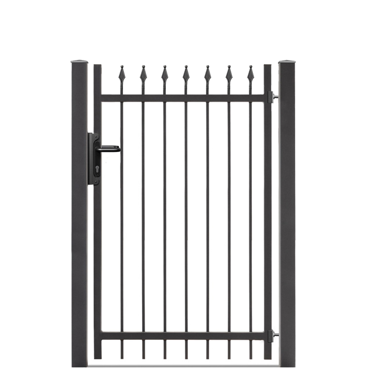 Das Schmiedezaun Gartentor CHELSEA mit Lilien-Ornamenten überzeugt durch die Kombination von klassischem Lilien-Design und Leichtigkeit auf der einen, sowie hochwertiger Verarbeitung und Stabilität auf der anderen Seite. Das Drehflügeltor wird mit zwei stabilen Pfosten, sowie sämtlichem benötigtem Zubehör (Türdrücker, Schloss) geliefert. Einen Profilzylinder können Sie hier als Zubehör erwerben oder einen eigenen Zylinder (zu Ihrer Schließanlage passend) hinzufügen. Wenn Zaunelemente direkt an einen Torpfosten angebunden werden sollen, muss ein Zaunanschluss dementsprechend als Zubehör hinzugefügt werden. Durch patentierte Scharniere lässt sich wahlweise ein Öffnungswinkel von 90° oder 180° bestimmen. Auch die Öffnungsrichtung ist vor Ort wählbar. Um die Torflügel im geöffneten Zustand zusätzlich seitlich zu fixieren, sind ebenfalls zwei praktische Seitenfeststeller enthalten.