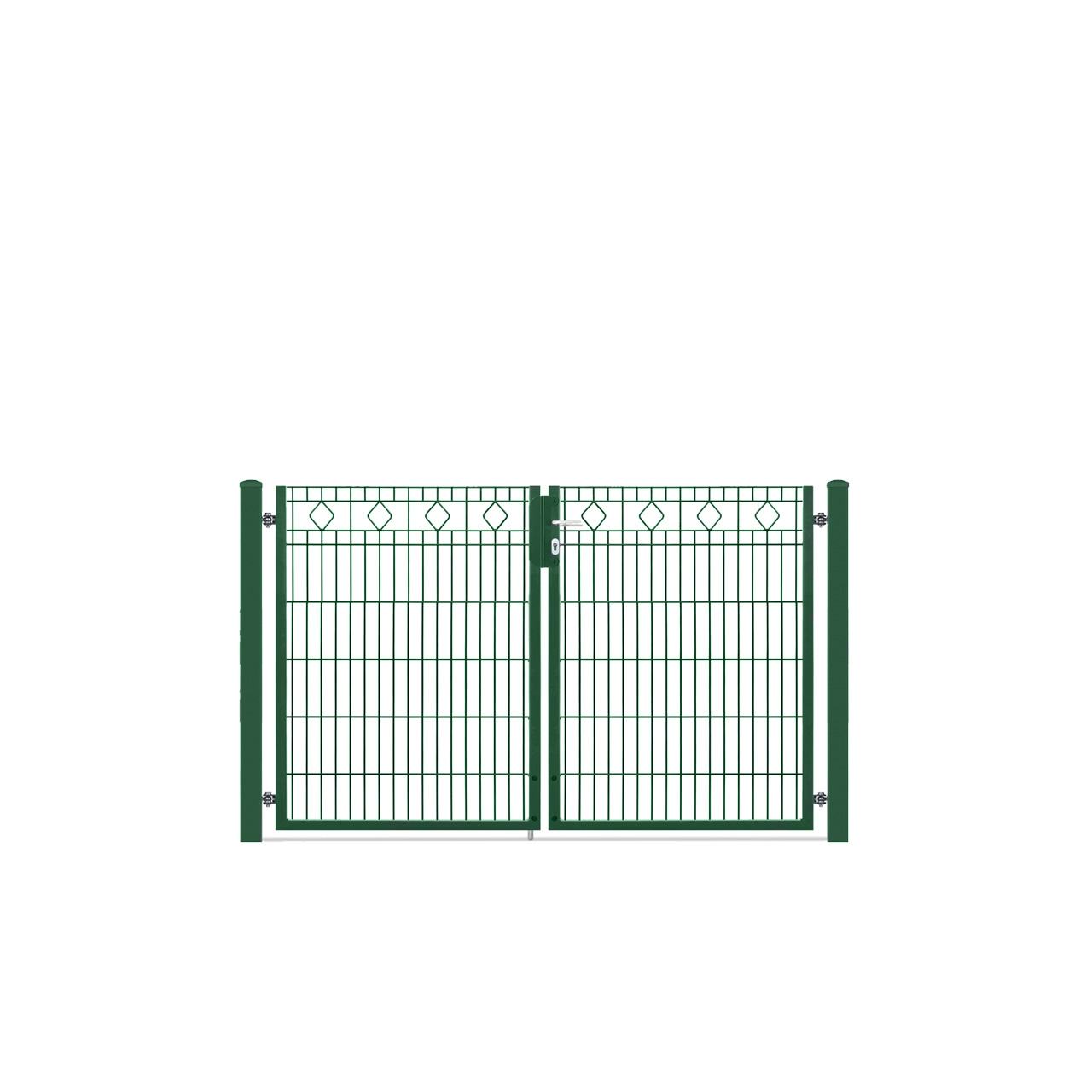 Die symmetrische Doppeltoranlage passend zum Schmuckzaun LINZ mit den Schmuckelementen (Rauten) im oberen Bereich ergänzt Ihre Zaunanlage. Jeder Torflügel besteht aus einem stabilen U-Rahmen und ist mit einem Schmuckzaunelement LINZ gefüllt. Durch patentierte Scharniere lässt sich wahlweise ein Öffnungswinkel von 90° oder 180° bestimmen. Auch die Öffnungsrichtung ist vor Ort wählbar. Zum Lieferumfang gehören zwei stabile Torpfosten zum Einbetonieren mit Kappe. Zum Lieferumfang gehören zudem eine Alu-Drückergarnitur, ein LocInox-Schloss (für Profilzylinder vorgerichtet, diesen bitte zusätzlich bestellen), der Anschlag, sowie alle benötigten Schrauben. Um die Torflügel im geöffneten Zustand zusätzlich seitlich zu fixieren, sind ebenfalls zwei praktische Seitenfeststeller enthalten.