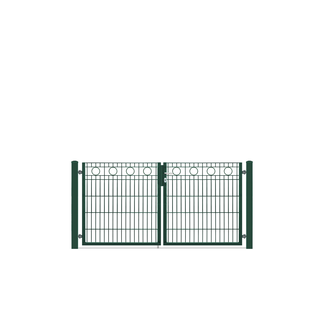 Die symmetrische Doppeltoranlage passend zum Schmuckzaun ROM mit den Schmuckelementen (Kreise) im oberen Bereich ergänzt Ihre Zaunanlage. Jeder Torflügel besteht aus einem stabilen U-Rahmen und ist mit einem Schmuckzaunelement LINZ gefüllt. Durch patentierte Scharniere lässt sich wahlweise ein Öffnungswinkel von 90° oder 180° bestimmen. Auch die Öffnungsrichtung ist vor Ort wählbar. Zum Lieferumfang gehören zwei stabile Torpfosten zum Einbetonieren mit Kappe. Zum Lieferumfang gehören zudem eine Alu-Drückergarnitur, ein LocInox-Schloss (für Profilzylinder vorgerichtet, diesen bitte zusätzlich bestellen), der Anschlag, sowie alle benötigten Schrauben. Um die Torflügel im geöffneten Zustand zusätzlich seitlich zu fixieren, sind ebenfalls zwei praktische Seitenfeststeller enthalten.
