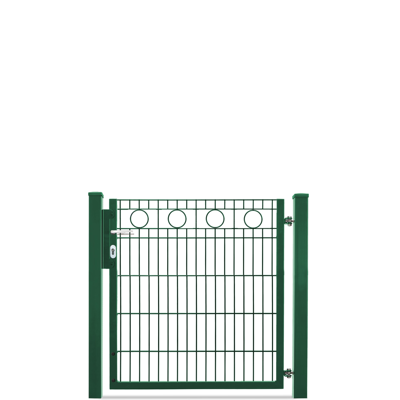 Passend zum Schmuckzaun ROM ist diese Gartentür mit den Schmuckelementen (Kreise) im oberen Bereich zur Vervollständigung Ihrer Zaunanlage erhältlich. Der Torflügel besteht aus einem stabilen U-Rahmen und ist mit einem Schmuckzaunelement LINZ gefüllt. Durch patentierte Scharniere lässt sich wahlweise ein Öffnungswinkel von 90° oder 180° bestimmen. Auch die Öffnungsrichtung ist vor Ort wählbar. Zum Lieferumfang gehören zwei Türpfosten zum Einbetonieren mit Kappe. Zum Lieferumfang gehören zudem eine Alu-Drückergarnitur, ein Schloss (für Profilzylinder vorgerichtet, diesen bitte zusätzlich bestellen), der Anschlag, sowie alle benötigten Schrauben. Um den Torflügel im geöffneten Zustand optimal seitlich zu fixieren, empfehlen wir unseren praktischen Seitenfeststeller mit Federschnapper und einfacher Fußbedienung (A14114).