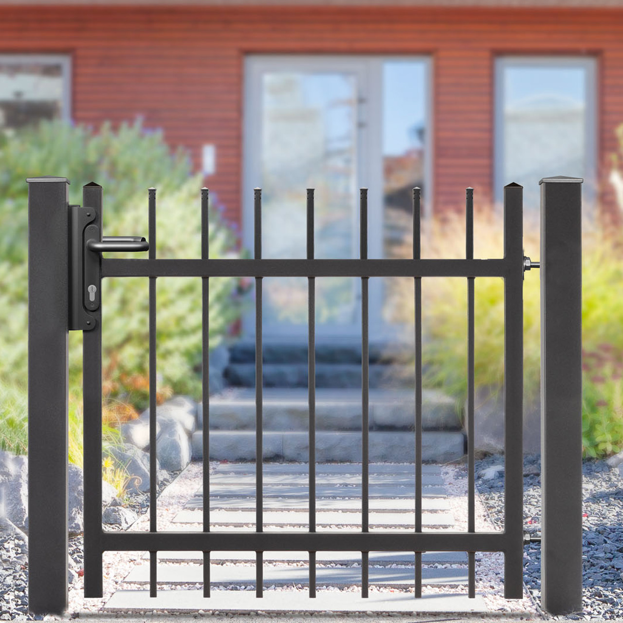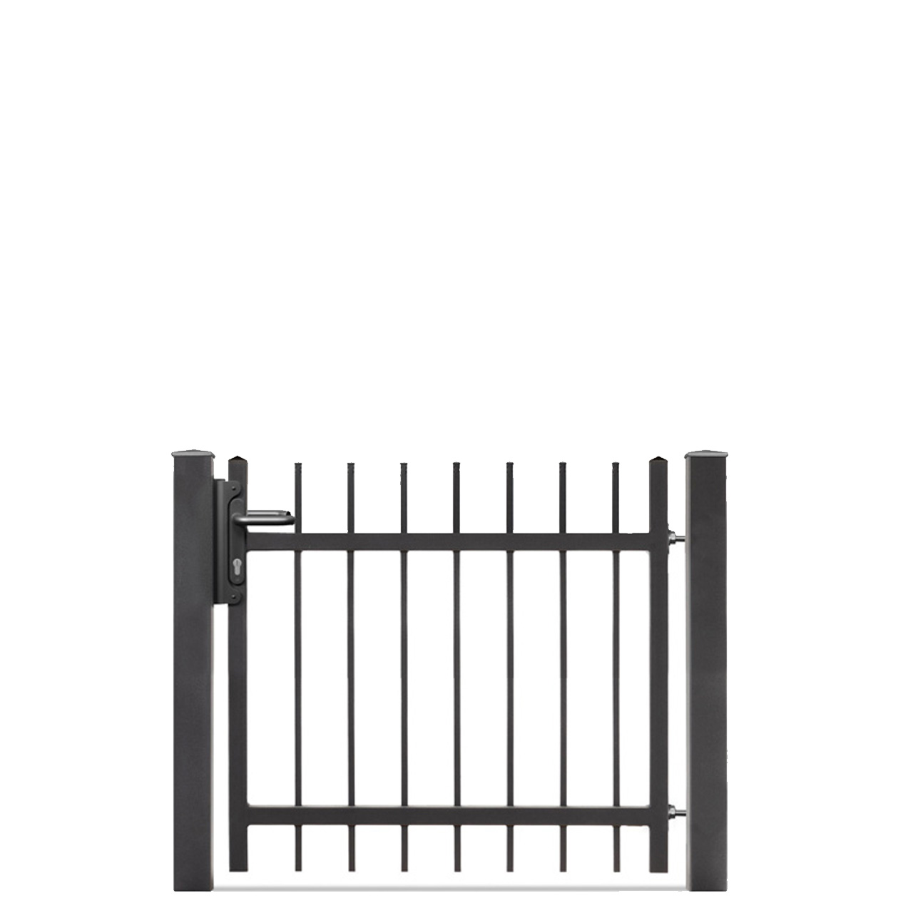 Das Schmiedezaun Gartentor WEMBLEY mit kleinen Zierpyramiden besticht durch die Kombination von Klassik und Leichtigkeit auf der einen, sowie hochwertiger Verarbeitung und Stabilität auf der anderen Seite. Das Drehflügeltor wird mit zwei stabilen Pfosten, sowie sämtlichem benötigtem Zubehör (Türdrücker, Schloss) geliefert. Einen Profilzylinder können Sie hier als Zubehör erwerben oder einen eigenen Zylinder (zu Ihrer Schließanlage passend) hinzufügen. Wenn Zaunelemente direkt an einen Torpfosten angebunden werden sollen, muss ein Zaunanschluss dementsprechend als Zubehör hinzugefügt werden. Durch patentierte Scharniere lässt sich wahlweise ein Öffnungswinkel von 90° oder 180° bestimmen. Auch die Öffnungsrichtung ist vor Ort wählbar. Um die Torflügel im geöffneten Zustand zusätzlich seitlich zu fixieren, sind ebenfalls zwei praktische Seitenfeststeller enthalten.