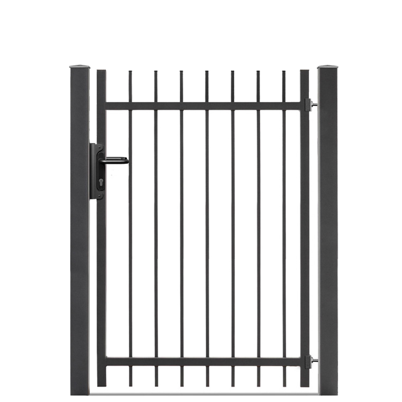 Das Schmiedezaun Gartentor YORK besticht durch die Kombination von Eleganz und Leichtigkeit auf der einen, sowie hochwertger Verarbeitung und Stabilität auf der anderen Seite. Das Drehflügeltor wird mit zwei stabilen Pfosten, sowie sämtlichem benötigtem Zubehör (Türdrücker, Schloss) geliefert. Einen Profilzylinder können Sie hier als Zubehör erwerben oder einen eigenen Zylinder (zu Ihrer Schließanlage passend) hinzufügen. Wenn Zaunelemente direkt an einen Torpfosten angebunden werden sollen, muss ein Zaunanschluss dementsprechend als Zubehör hinzugefügt werden. Durch patentierte Scharniere lässt sich wahlweise ein Öffnungswinkel von 90° oder 180° bestimmen. Auch die Öffnungsrichtung ist vor Ort wählbar. Um die Torflügel im geöffneten Zustand zusätzlich seitlich zu fixieren, sind ebenfalls zwei praktische Seitenfeststeller enthalten.